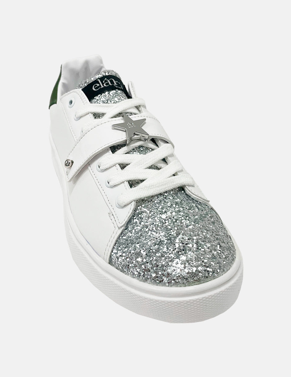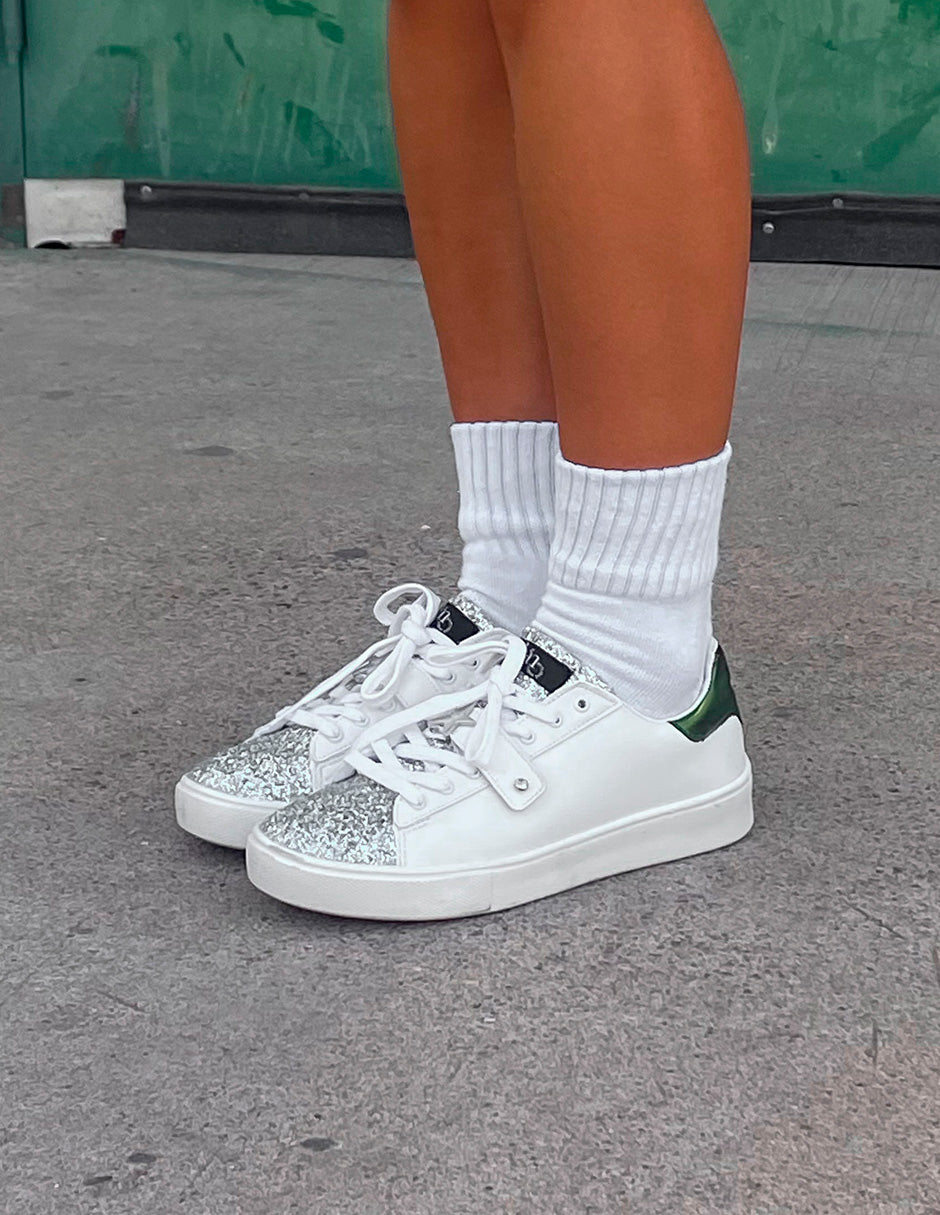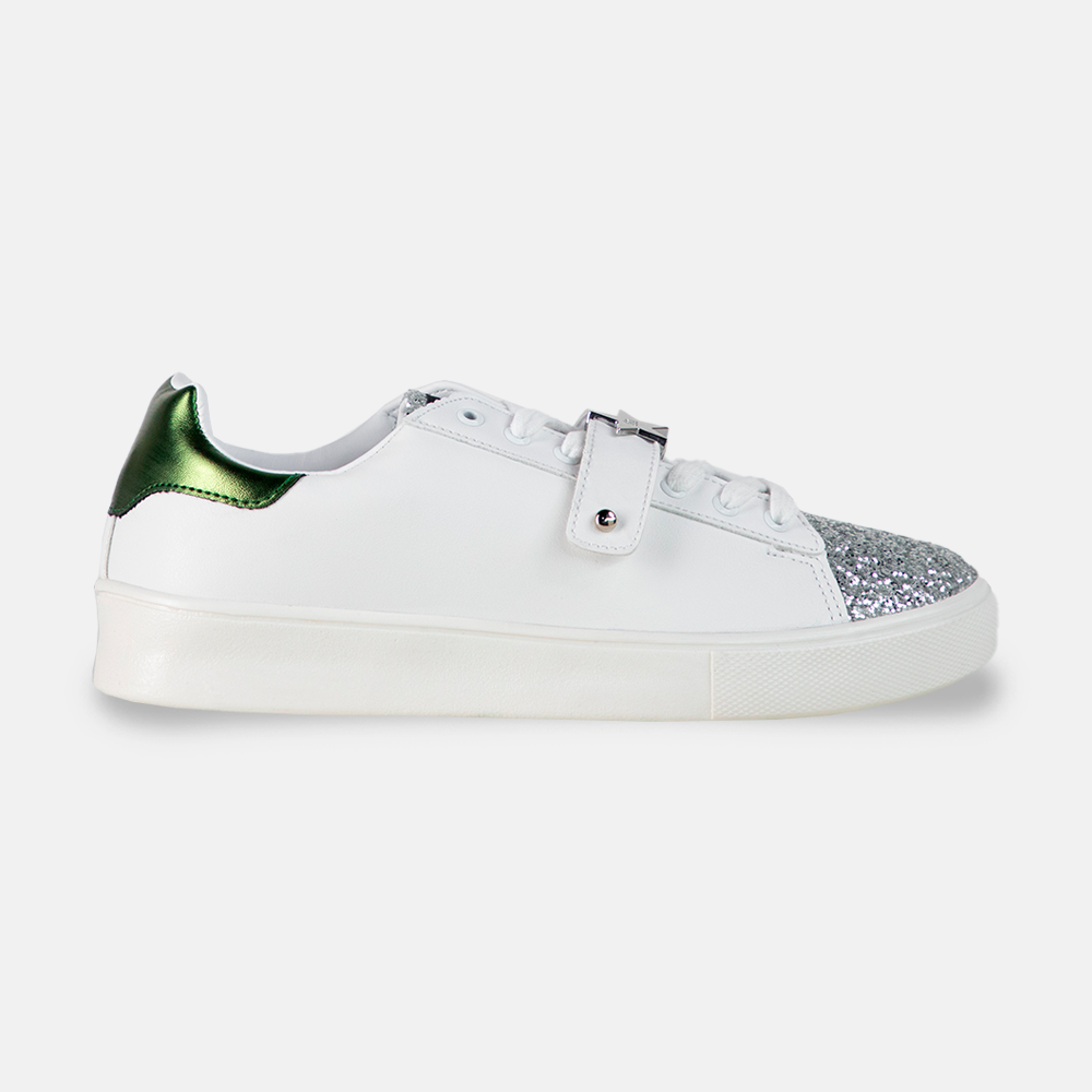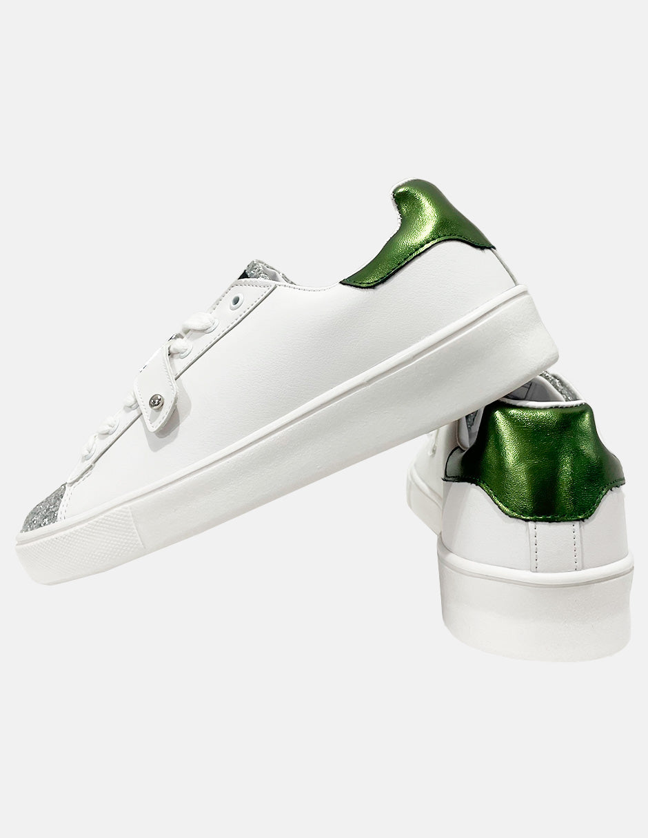 Introducing The Anastasia sneakers, where timeless elegance meets modern flair. Crafted from sustainable synthetic materials, these white sneakers redefine eco-conscious fashion with a touch of sparkle. Their sleek design is elevated by a tongue adorned with silver glitter and subtle green accents at the back, adding a hint of sophistication. Featuring a unique strap atop the laces, these sneakers offer a customizable fit and an opportunity to accessorize with special charms. Not only do they provide a personalized adjustment, but they also allow for further customization to suit your unique style. These sneakers effortlessly blend sophistication with urban charm, offering a fresh and stylish interpretation of classic footwear.