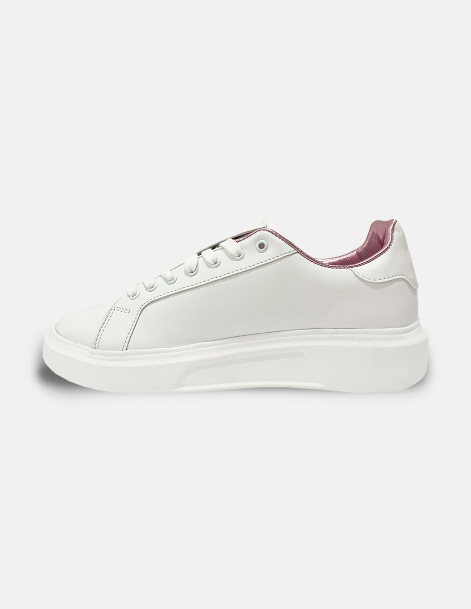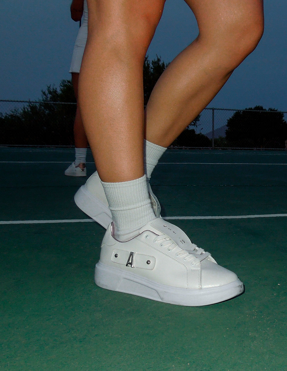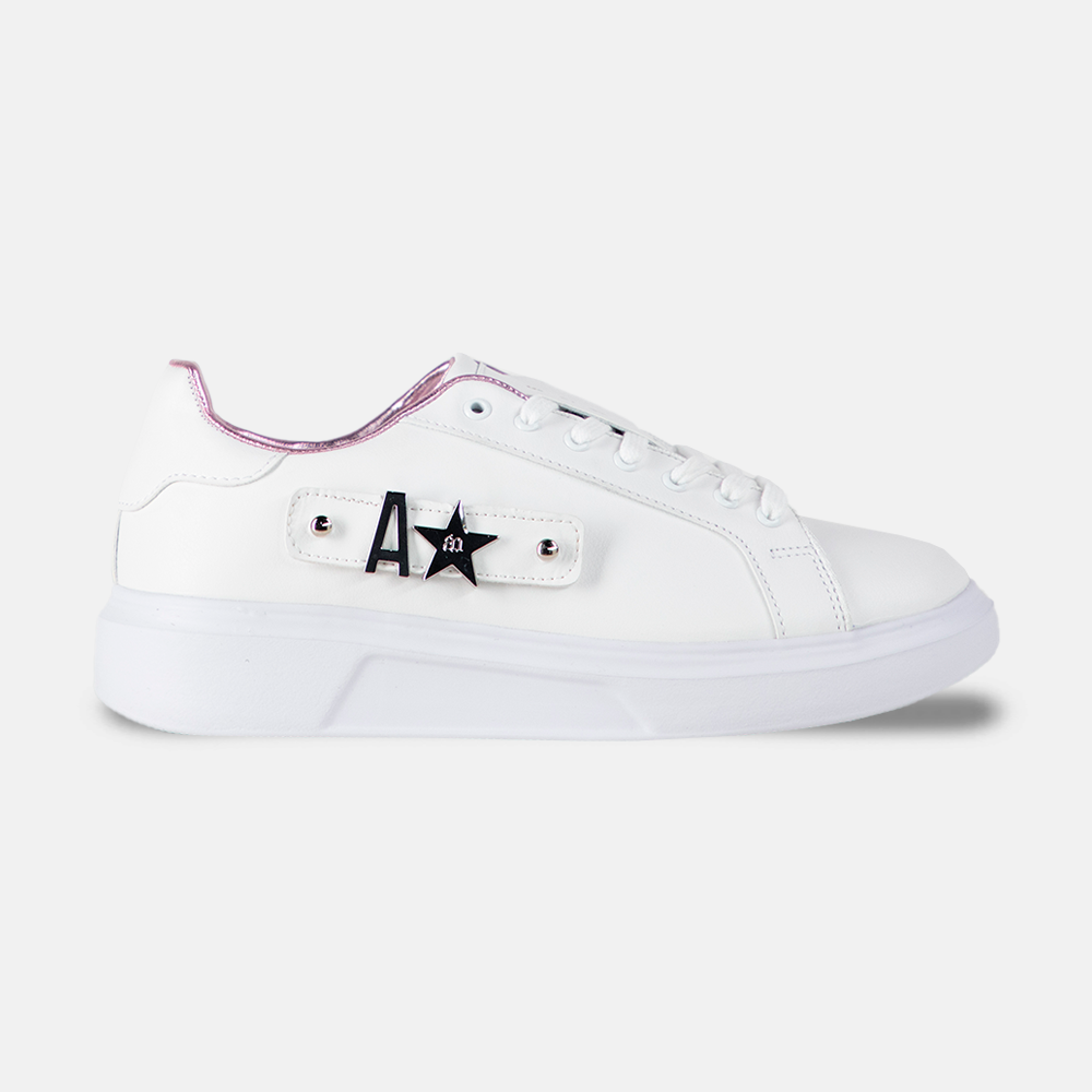 Introducing The Antonella sneakers: classic meets contemporary. Crafted from sustainable synthetic materials, these full white sneakers redefine eco-conscious fashion. With a slight sole elevation and a small side strap for charm customization, they effortlessly blend sophistication with urban charm. Inside, a touch of pink adds a playful twist. Perfect for personalized style and eco-friendly fashion.