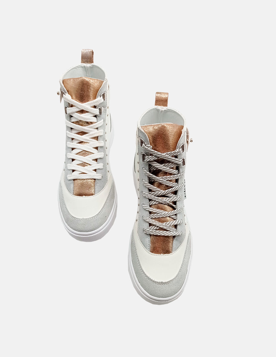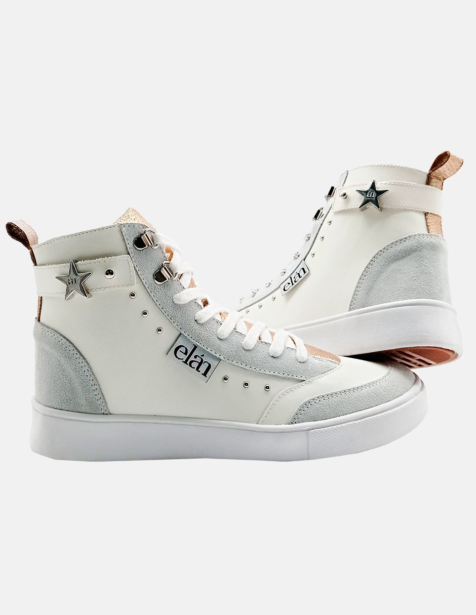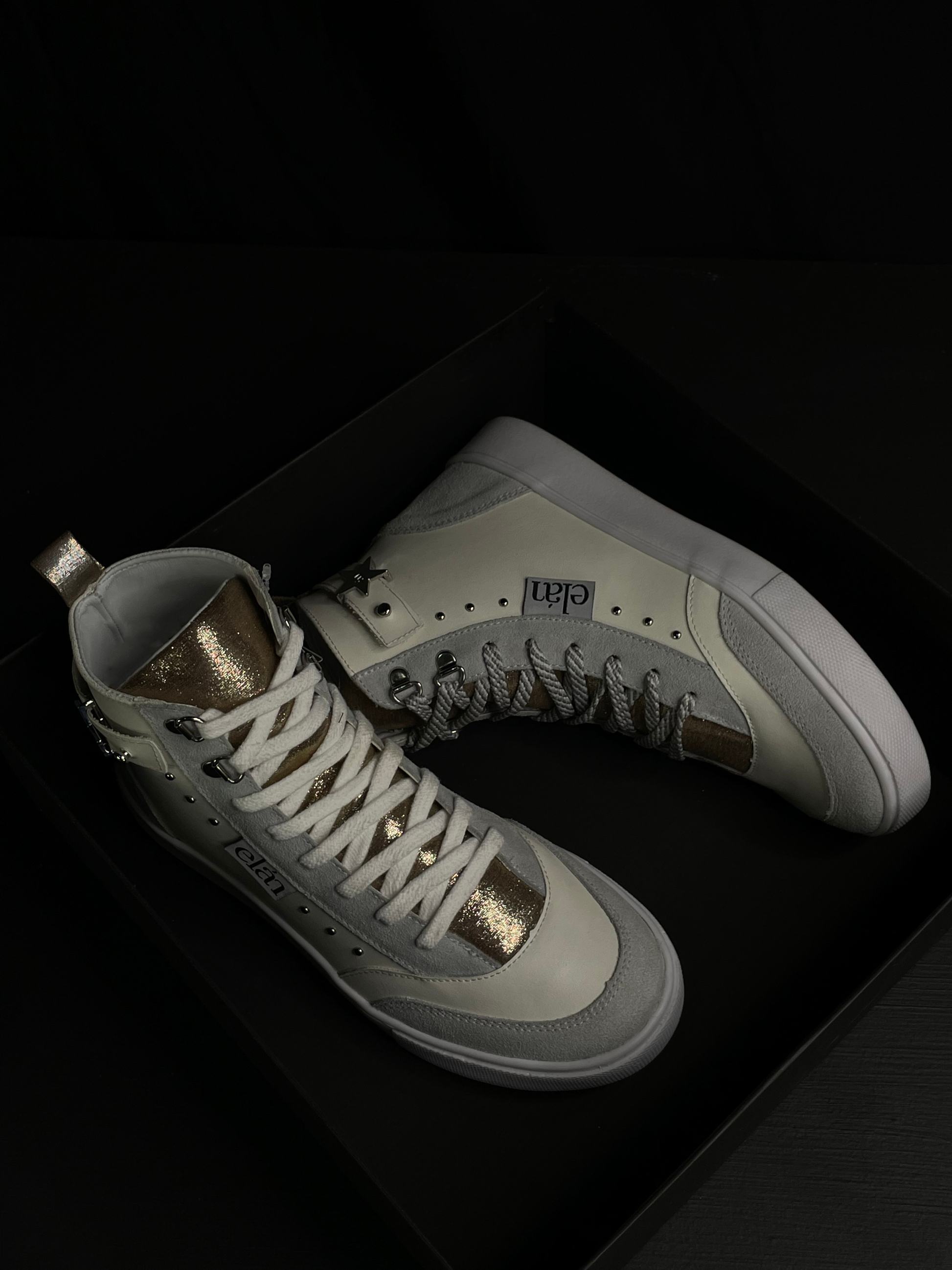 Introducing The Cordelia high-rise sneakers, blending urban chic with comfort. These vegan sneakers gleam in pristine white, adorned with a golden tongue and subtle gray accents, exuding sophistication. Crafted from nopal leather, they embody ethical fashion. Enhanced with delicate metal stitches and offering versatility with two sets of laces - one pair in pure white and the other featuring gray lines with white accents - The Cordelia redefines urban style.