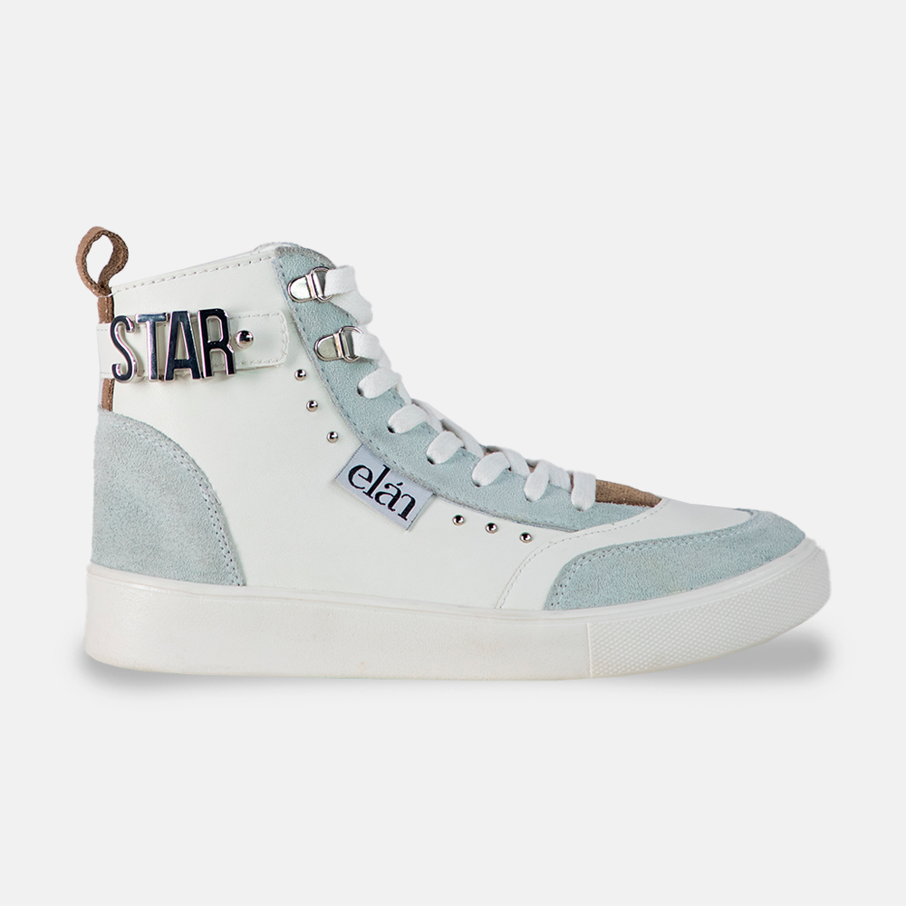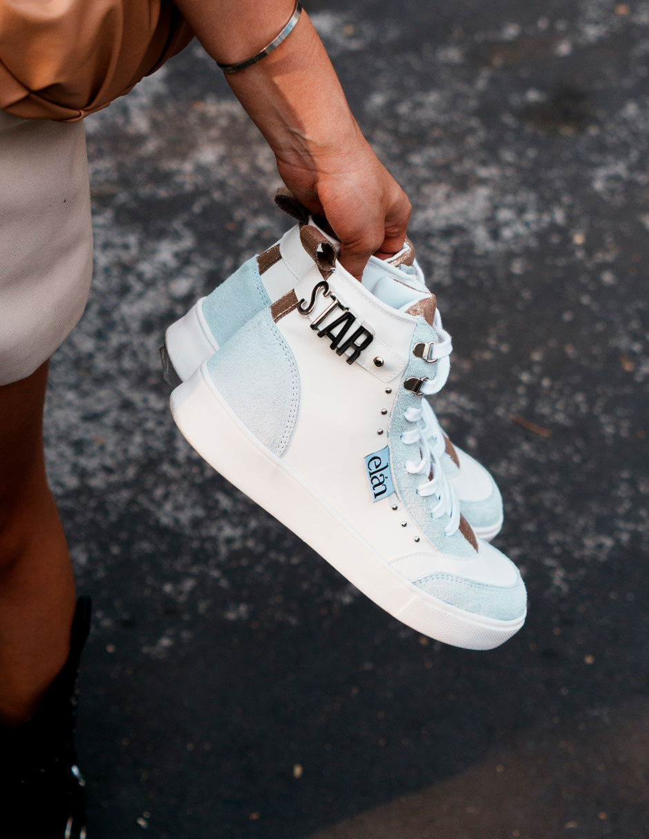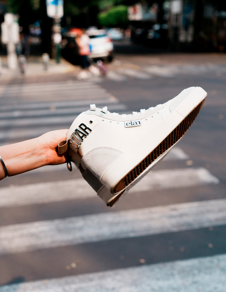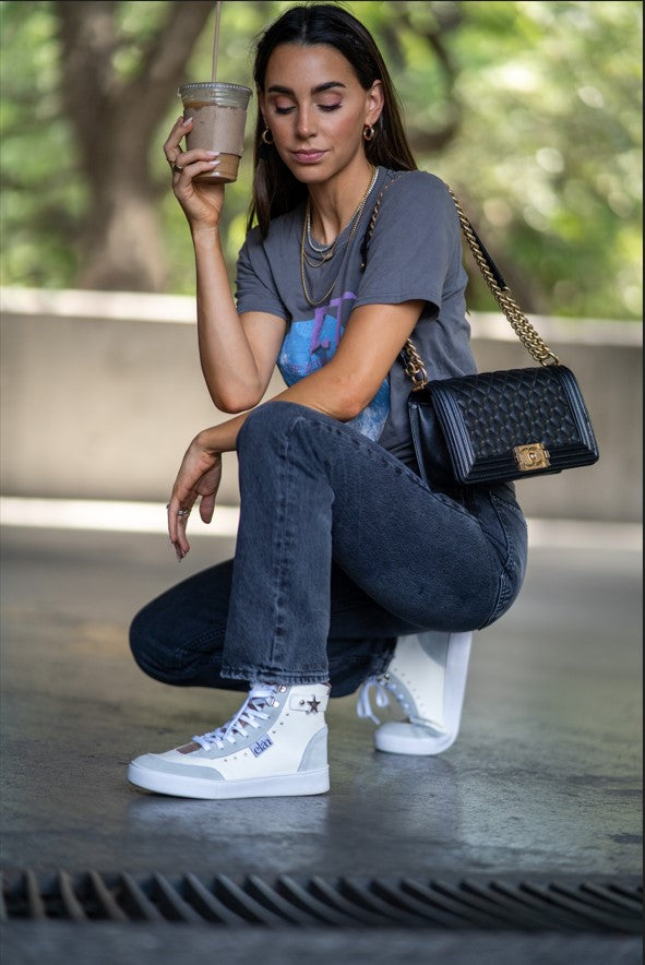 Introducing The Cordelia high-rise sneakers, blending urban chic with comfort. These vegan sneakers gleam in pristine white, adorned with a golden tongue and subtle gray accents, exuding sophistication. Crafted from nopal leather, they embody ethical fashion. Enhanced with delicate metal stitches and offering versatility with two sets of laces - one pair in pure white and the other featuring gray lines with white accents - The Cordelia redefines urban style.